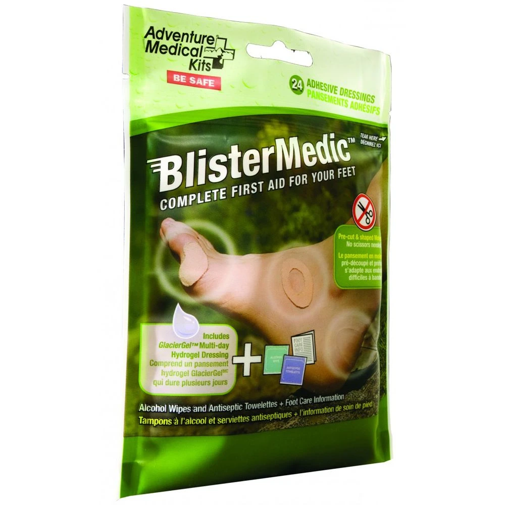The Blister Medic is the best of both worlds, combining the tried-and-true protection and blister prevention of Moleskin with the advanced relief and healing of Glacier Gel™ hydrogel dressings. Alcohol pads for skin preparation and antiseptic towelettes for wound cleaning round out the package.