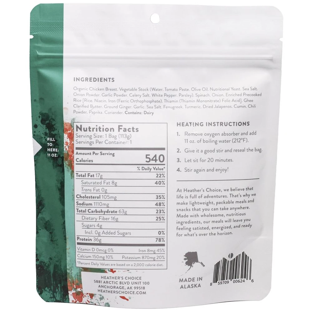 - Ingredients: Organic Chicken Breast. Vegetable Stock (Water. Tomato Paste. Olive Oil. Nutritional Yeast. Sea Salt. Onion Powder. Garlic Powder. Celery Salt. White Pepper. Parsley). Spinach. Onion. Enriched Precooked Rice [Rice. Niacin. Iron (Ferric Orthophosphate). Thiamin (Thiamin Mononitrate). Folic Acid]. Ghee Clarified Butter. Ground Ginger. Garlic. Sea Salt. Fenugreek. Turmeric. Dried Jalapeños. Cumin. Chili Powder. Paprika. Coriander.
