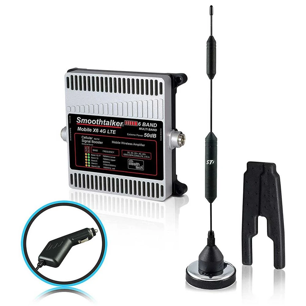 Mobile X6 50dB is the highest power 50cB gain mobile booster on the market. It will keep you connected where other boosters fail. It boosts signal to all call phones and cellular devices within the boosters range simultaneously. This is a wireless booster that does not require a physical connection to the call phone or cellular data device. The smoothtalker Mobile X6 extreme power booster is the most technologically advanced wireless cellular booster made. It features proprietary “stealth tech technology” that prevents shutdowns from poor antenna placement and changing environment. This booster has 50dB of gain and provides coverage throughout yor car, truck, RV, boats and work trailers.
